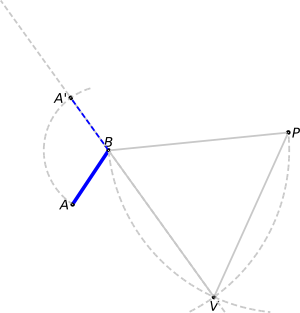We will now turn our original blue segment wrt B, so that we can *align* it along the direction VB. For this, we first *produce* (extend) the line dictated by VB. Then we pin the compass at B and draw a circle from A to the latter line. Where the circle cuts the line, point A', we have a blue segment with the same length than AB. We have increased the line width of AB to remark that this is our original segment.