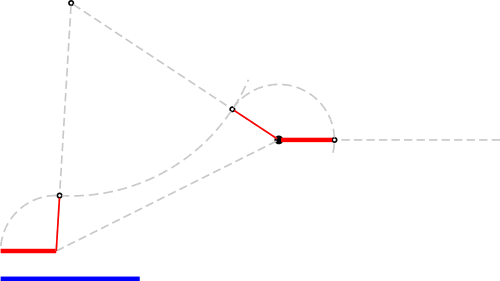 The next step is to do the same for the blue segment, but now, instead of transporting such segment to the black point, we do transport it to the point in which the transported red segment ends. Again, we connect one extreme of the blue segment to the point where we want to transport it, we build the equilateral triangle, we align the segment with one of its sides (inwards again), we pivot the arm and finally we rotate the segment along the horizontal direction.