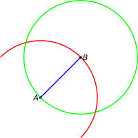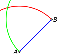 Now we take the compass and describe a red circle with centre in A and radius AB, and a green circle with centre in B and radius BA: