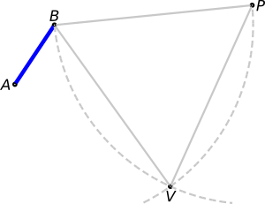 We will now turn our original blue segment wrt B, so that we can *align* it along the direction VB. For this, we first *produce* (extend) the line dictated by VB. Then we pin the compass at B and draw a circle from A to the latter line. Where the circle cuts the line, point A', we have a blue segment with the same length than AB. We have increased the line width of AB to remark that this is our original segment.