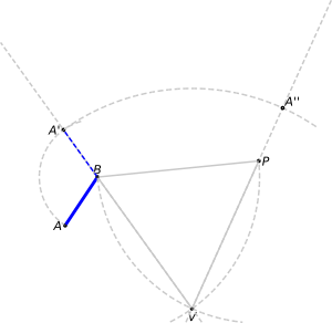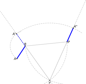 It is clear now that PA" = AB, because VB = VP and VA' = VA". We can draw in blue the final segment, to remark it has the same length as the original.