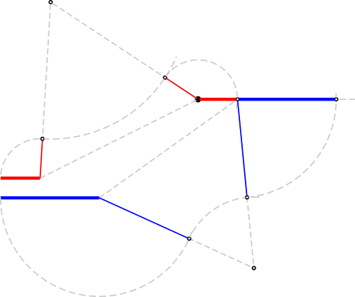 The next step is to do the same for the blue segment, but now, instead of transporting such segment to the black point, we do transport it to the point in which the transported red segment ends. Again, we connect one extreme of the blue segment to the point where we want to transport it, we build the equilateral triangle, we align the segment with one of its sides (inwards again), we pivot the arm and finally we rotate the segment along the horizontal direction.